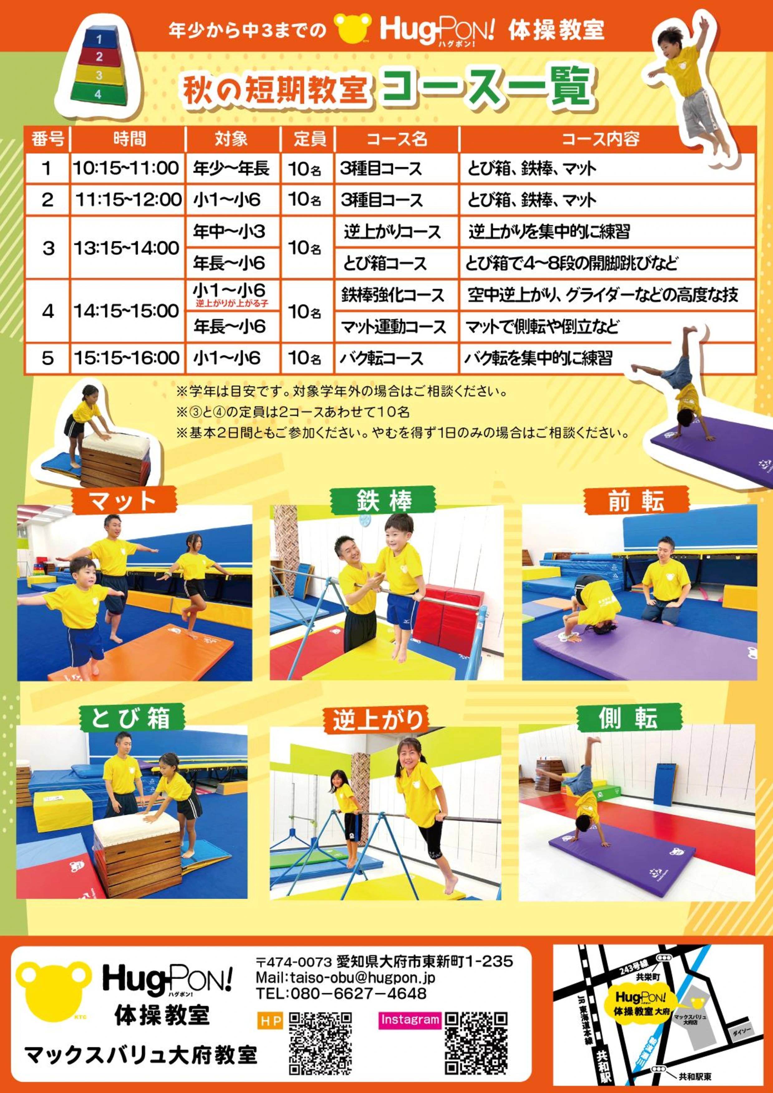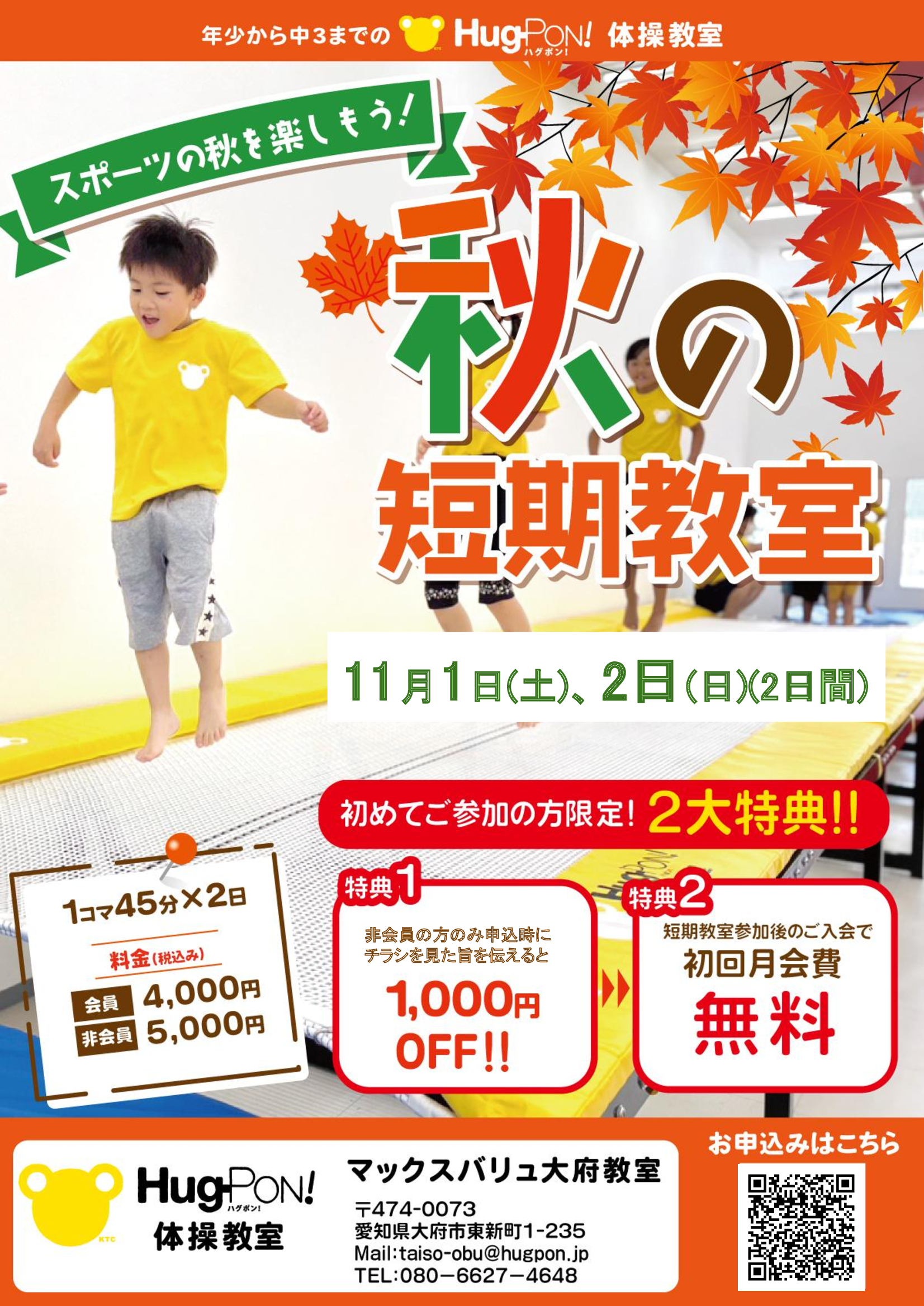 HugPON!体操教室では、11月1日・2日を使って短期教室を開催します!