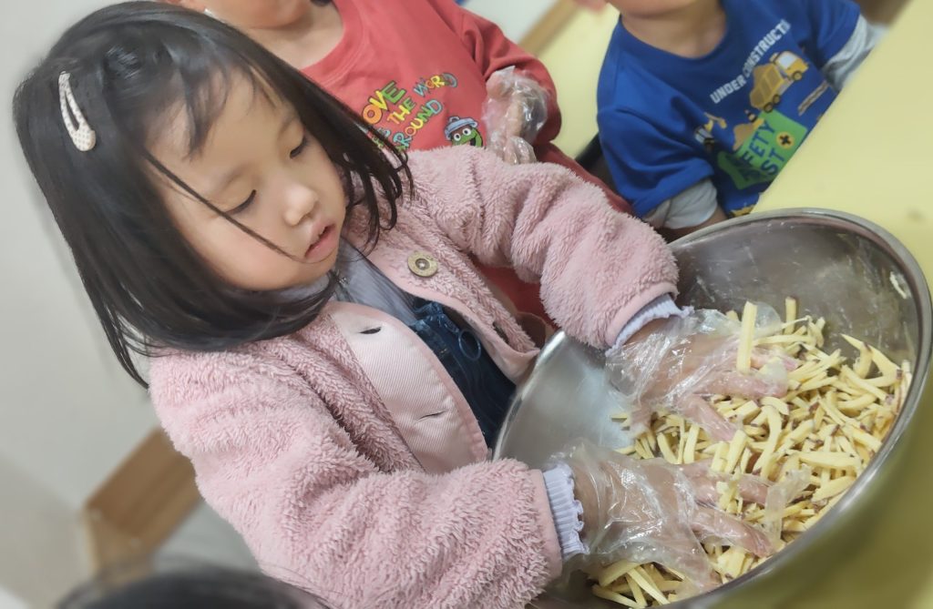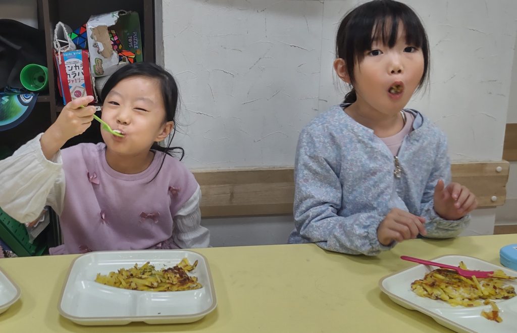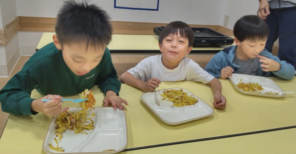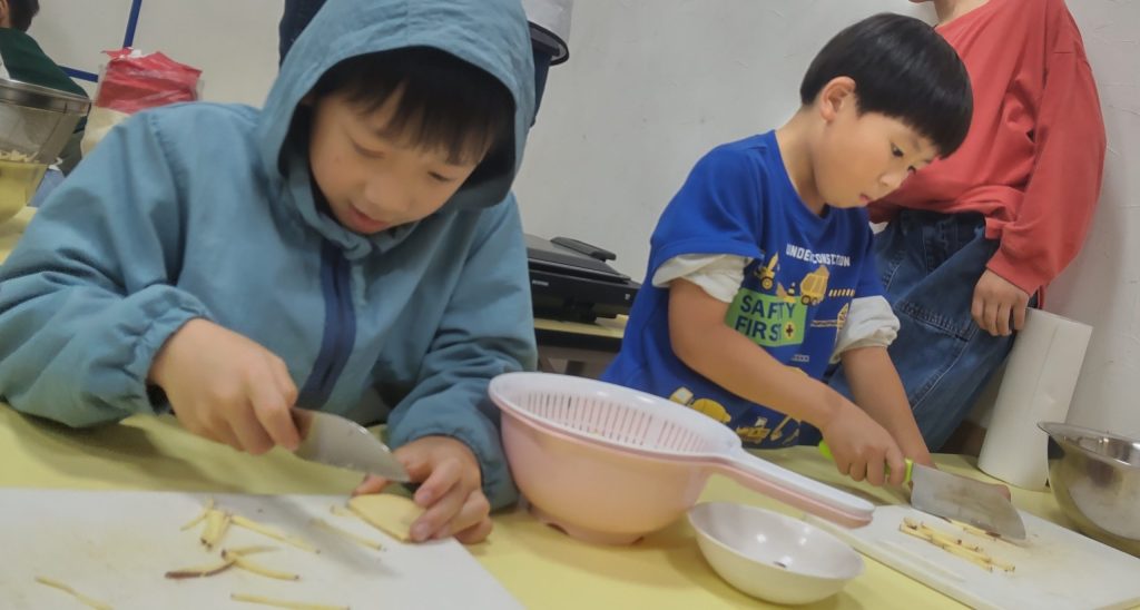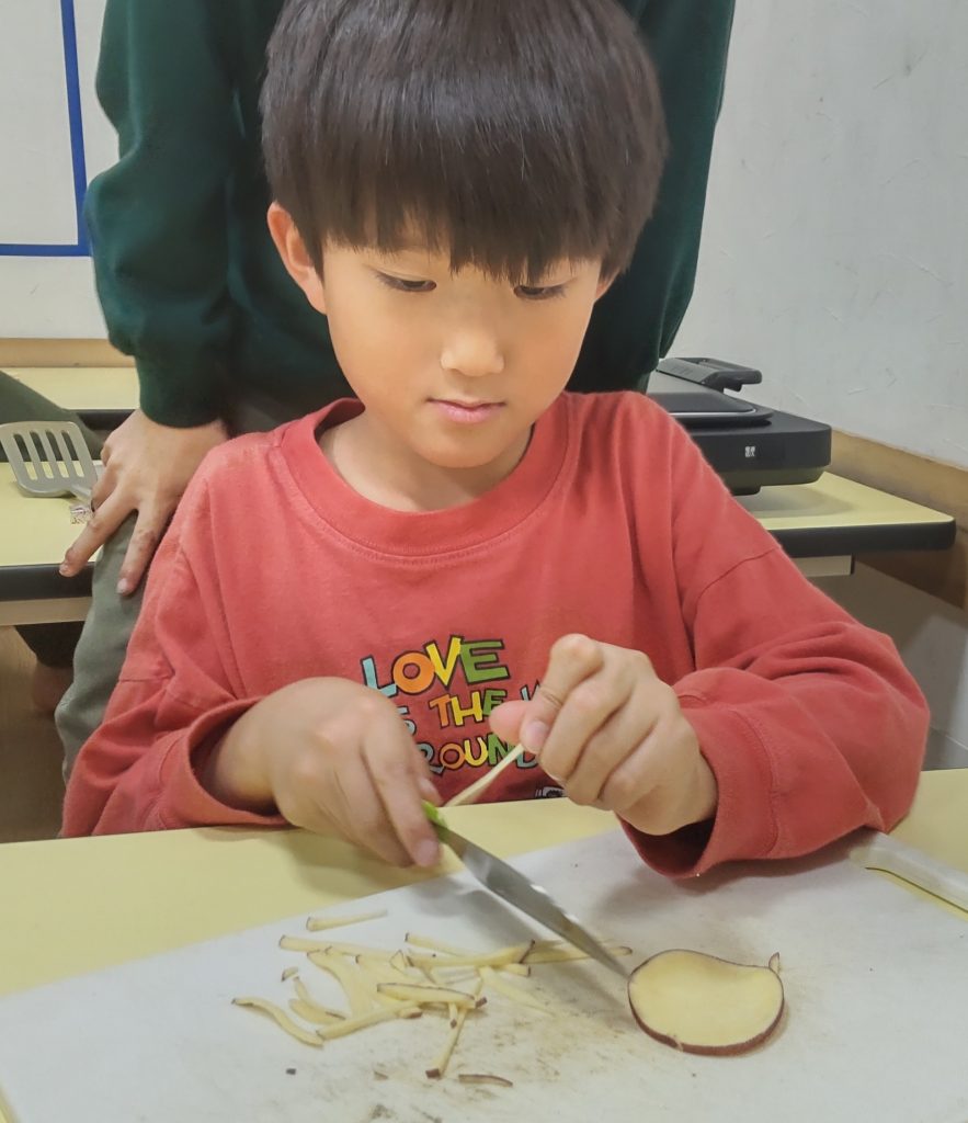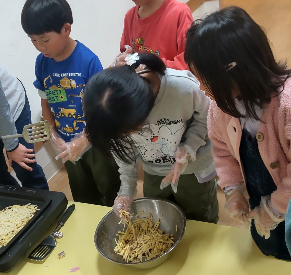 おさつガレットでは、予め薄くスライスしたさつまいもを細切りにしていきます🍠薄いスライスの状態でもさつまいもは固く、ミンナ力を込めて包丁を握っていました。さつまいもに小麦粉とコンソメを投入してよく混ぜます。ホットプレートに半量、円く広げてのせて、その上にチーズをたっぷりのせて、更に残りのさつまいもをのせ、5分ほど焼きます。裏返してバターをのせて、更に5分程こんがりするまで焼いていると、バターとさつまいものいい匂いが広がってきます。切り分けたら、はちみつをかけていただきました😋さつまいも&はちみつの甘みと、チーズ&バターの塩味が抜群で、ミンナ『美味しい‼』と食べていました✨簡単で美味しいので是非お家でも作ってみてください🤗
