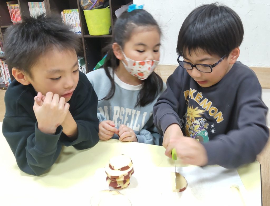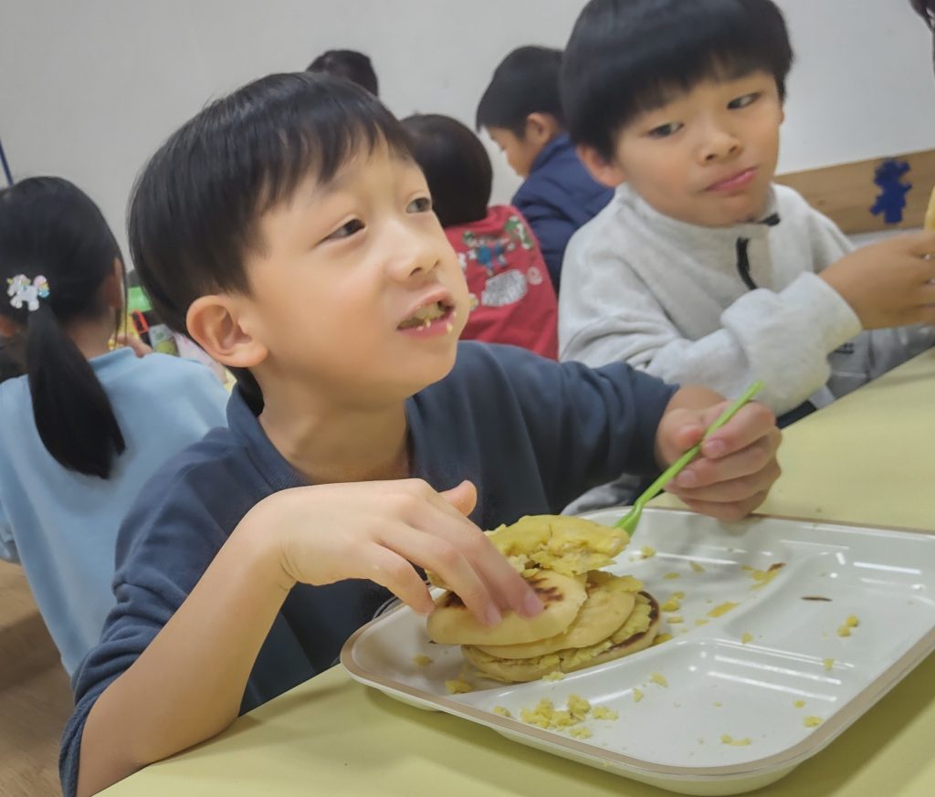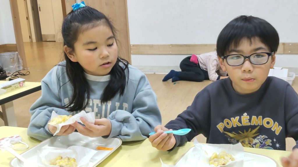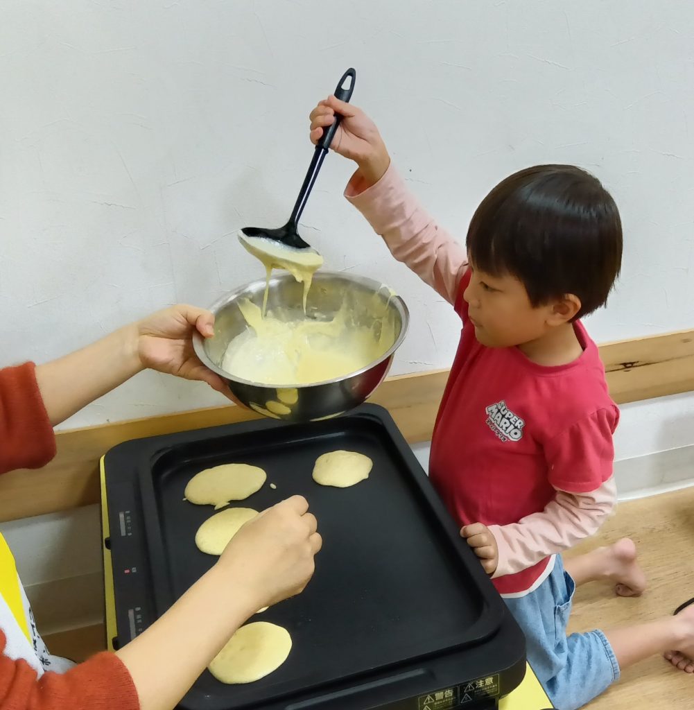 どらやきでは、『あずきあん』と『さつまいもあん』の二種類のあんを作ります。『さつまいもあん』は🍠を潰す行程から。ミンナで皮をむいて、砂糖とバターを入れて潰しながら混ぜます。次に牛乳を少量ずつ入れて滑らかなあんに仕上げます。パン生地はホットケーキミックスを使用しました。ジブンの生地はジブンでお玉を使いホットプレートに入れて、ジブンで返しも行いました🤗小さい丸にするのが少し大変だったね😅生地が焼けて『あずきあん』と『さつまいもあん』を好きな分量挟んでいったらジブンだけのどら焼きの出来上がりです✨ミンナ「とってもおいしい💛」と笑顔で食べていましたよ😋