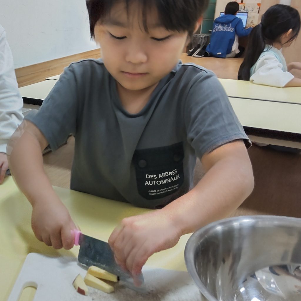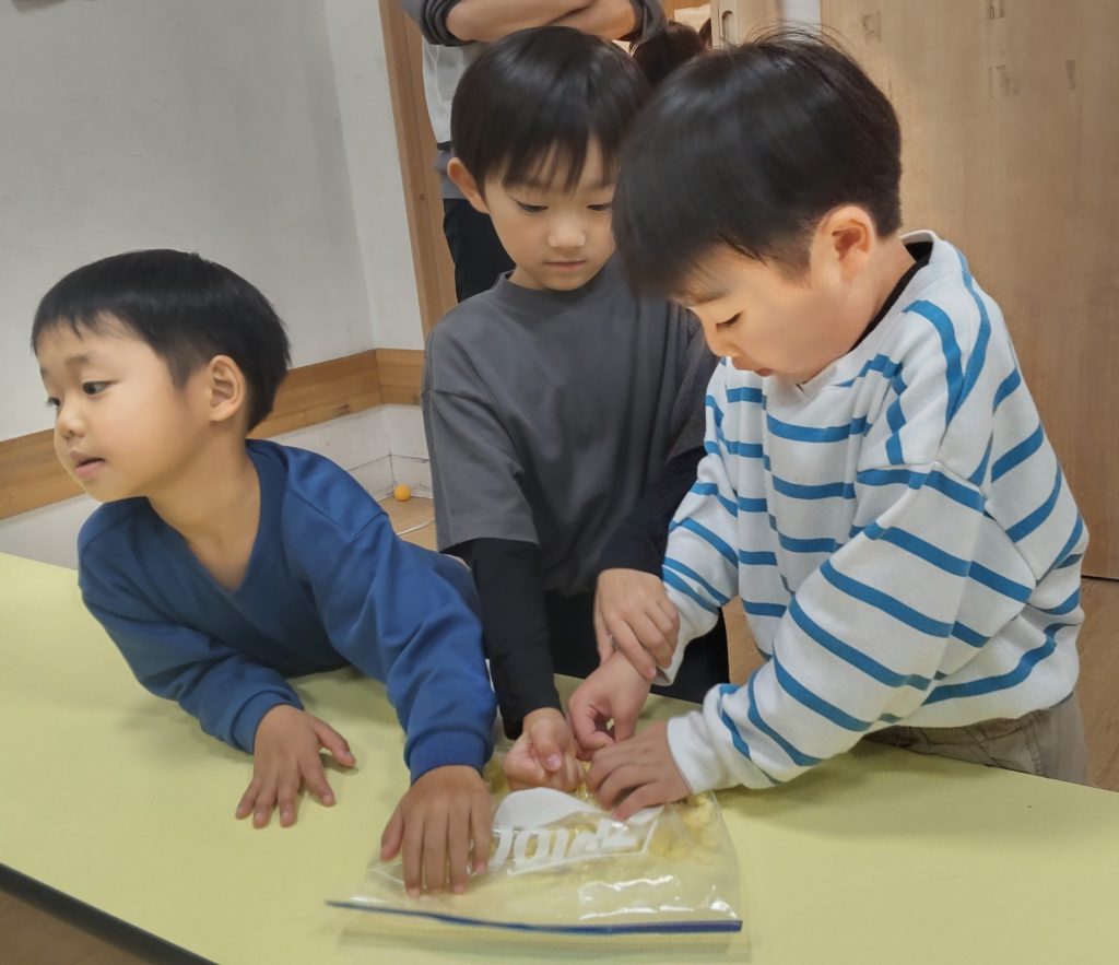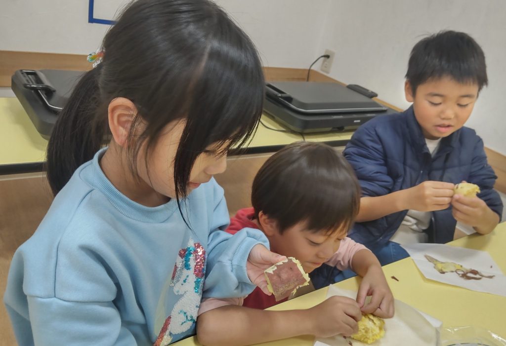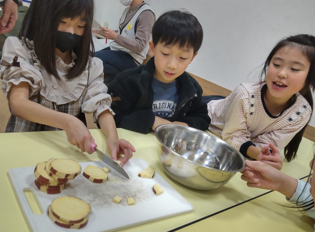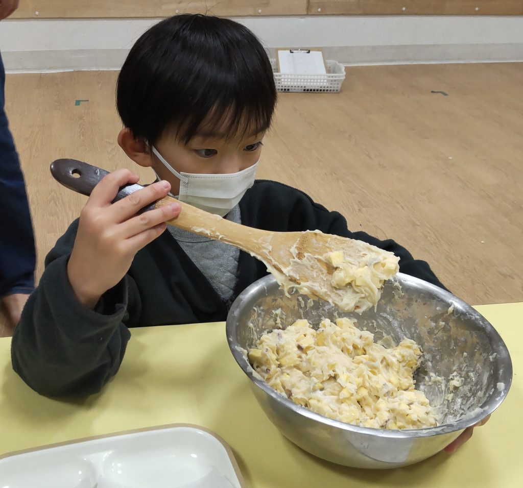 鬼まんじゅうでは🍠を包丁で切る行程から。予め薄めにカットした🍠を1㎝角に切ります。硬い🍠を切るのは大変で💦ミンナ四苦八苦しながらカットしました。🍠は砂糖をまぶし10分置きます。🍠と薄力粉を混ぜて水を少量ずつ加えていきます。混ぜ合わせるのもかなり力が必要で、ミンナ腕まくりをして力を込めて混ぜていました。クッキングペーパーの上にこんもりと生地をのせて、蒸し器で15分蒸したら出来上がりです。熱々の鬼まんじゅうをミンナ「熱いけどおいしい😋」と笑顔で食べていました✨11月はさつまいもで三種のおやつを作って、ミンナでおいしくいただきました🤗どれも簡単でとってもおいしいので、是非ご家庭でも一緒に作ってみてください😊