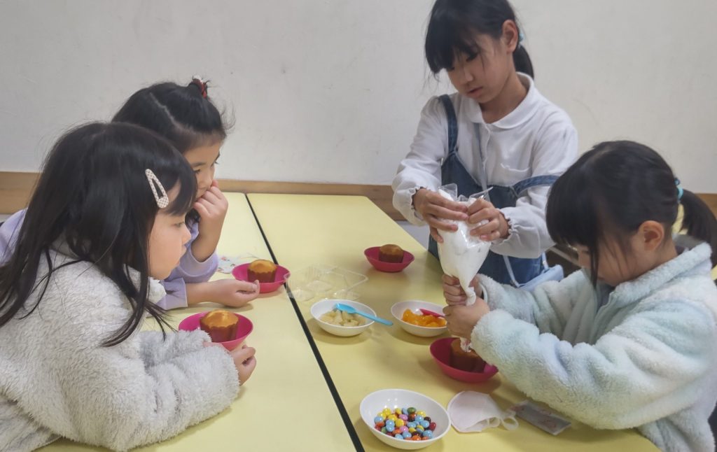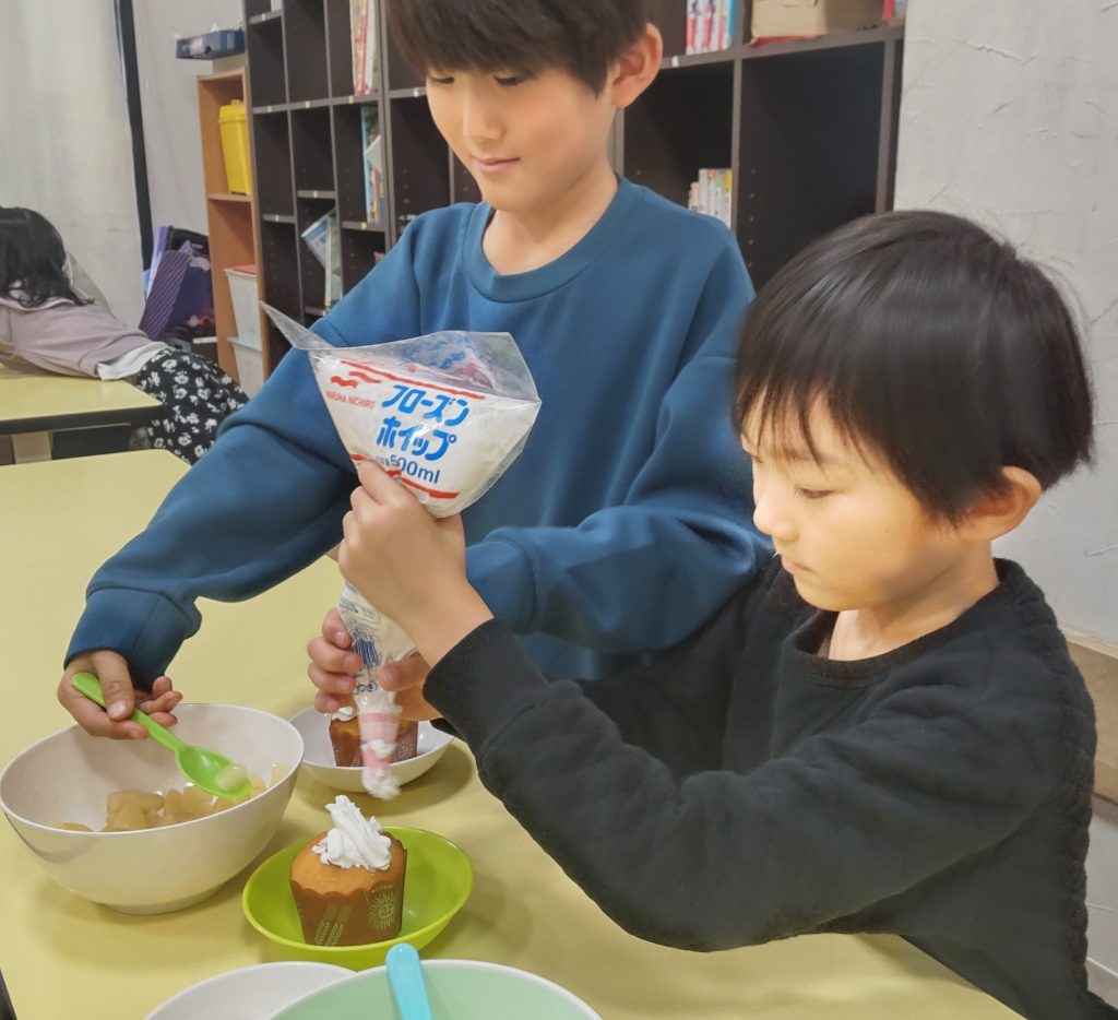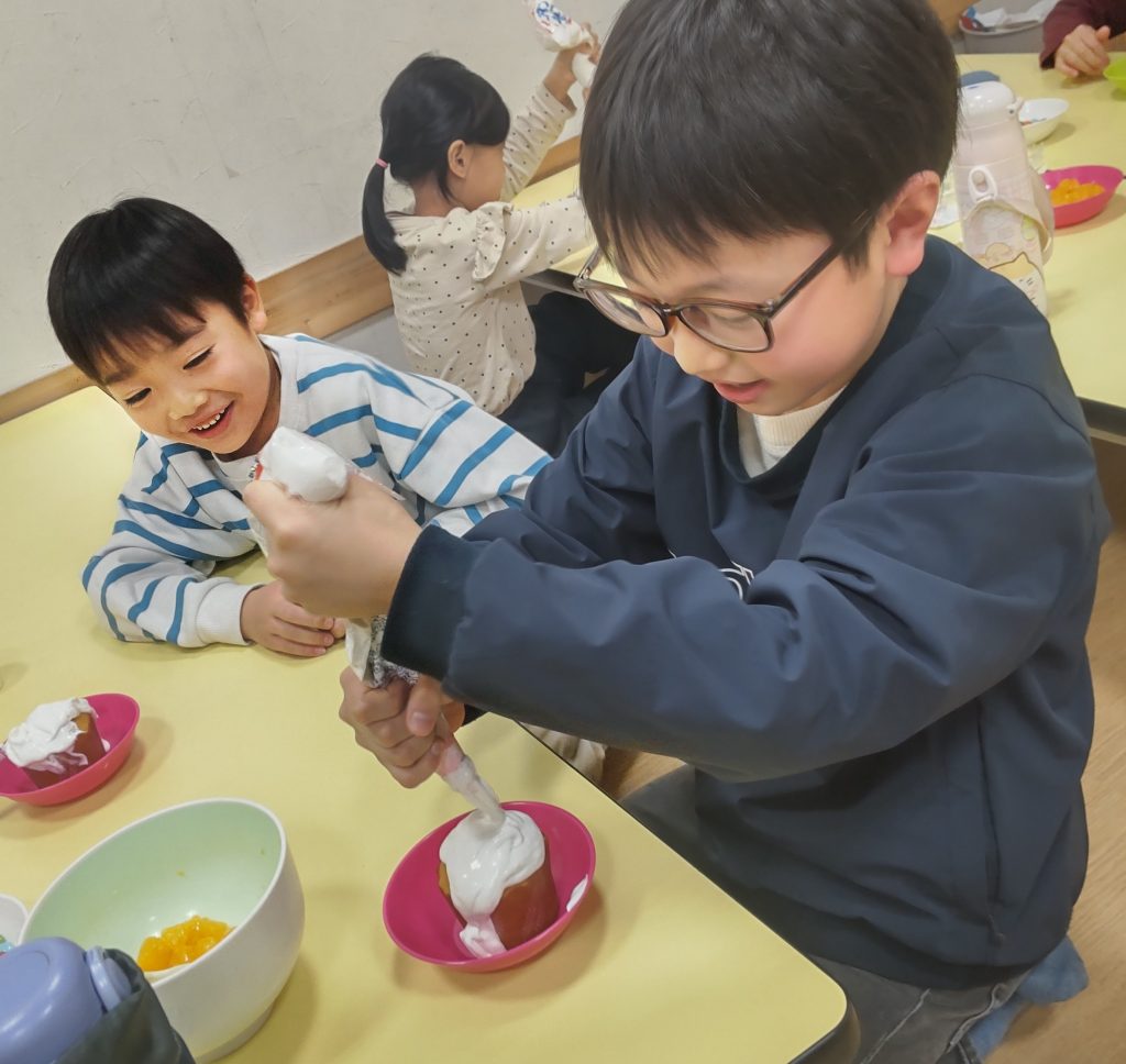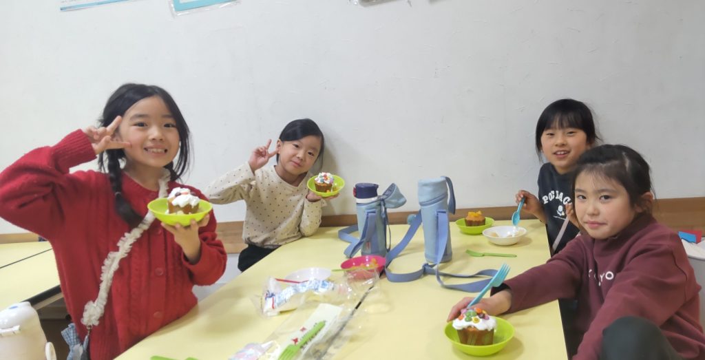 まずは工作から。紙コップを利用したプレゼントBOXを作りました。紙コップの飲み口部分を✂で切り取り、放射状に8本・3cmの切り込みを入れて内側に折り込んでいくと小さなBOXができます。中に小さなお菓子と消しゴムを入れてマスキングテープで可愛く留めて、上に🎀を付けたら出来上がり🎁次はクッキング。カップケーキに好きなだけホイップクリームをデコレーション💛トッピングは果物とマーブルチョコ🍫ミンナとても楽しそうに嬉しそうにホイップクリームを塗りたくっていましたよ😋最後はミンナのお楽しみ、ビンゴ大会です!🎅も登場し盛大に盛りあがったビンゴ大会でした😆