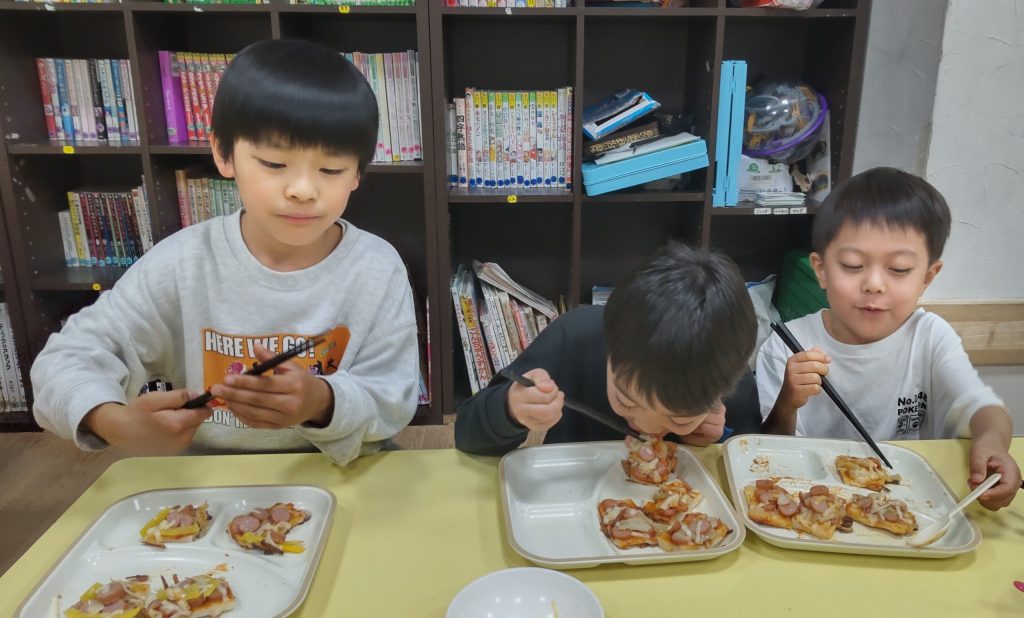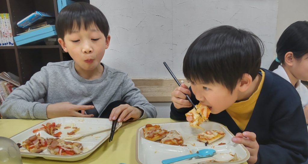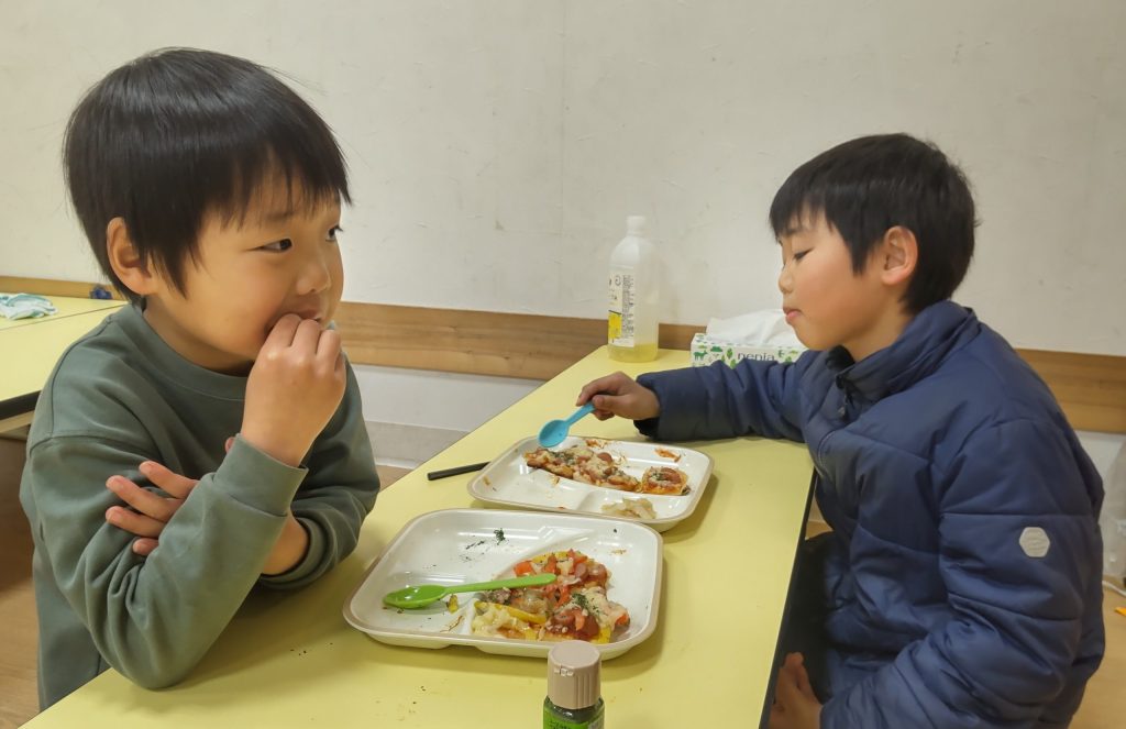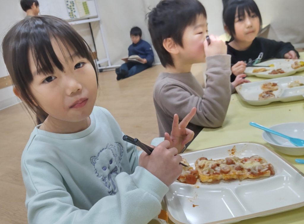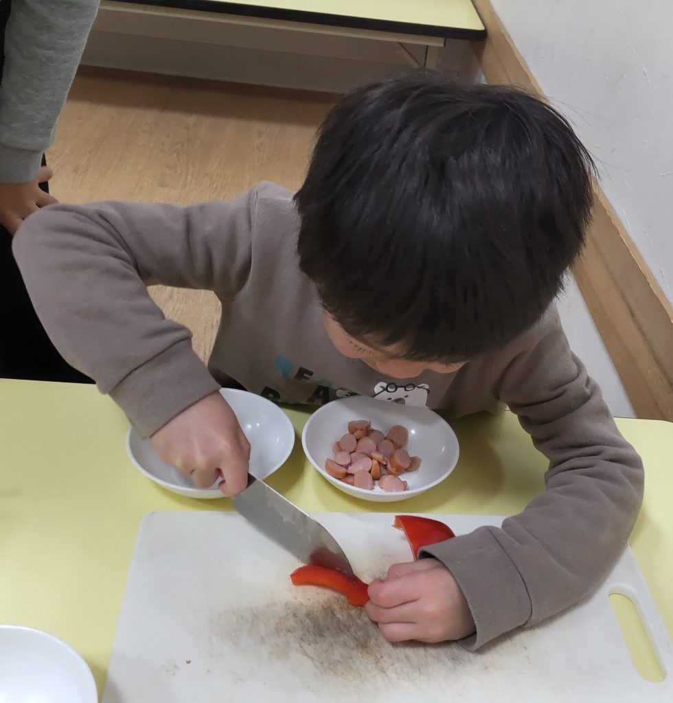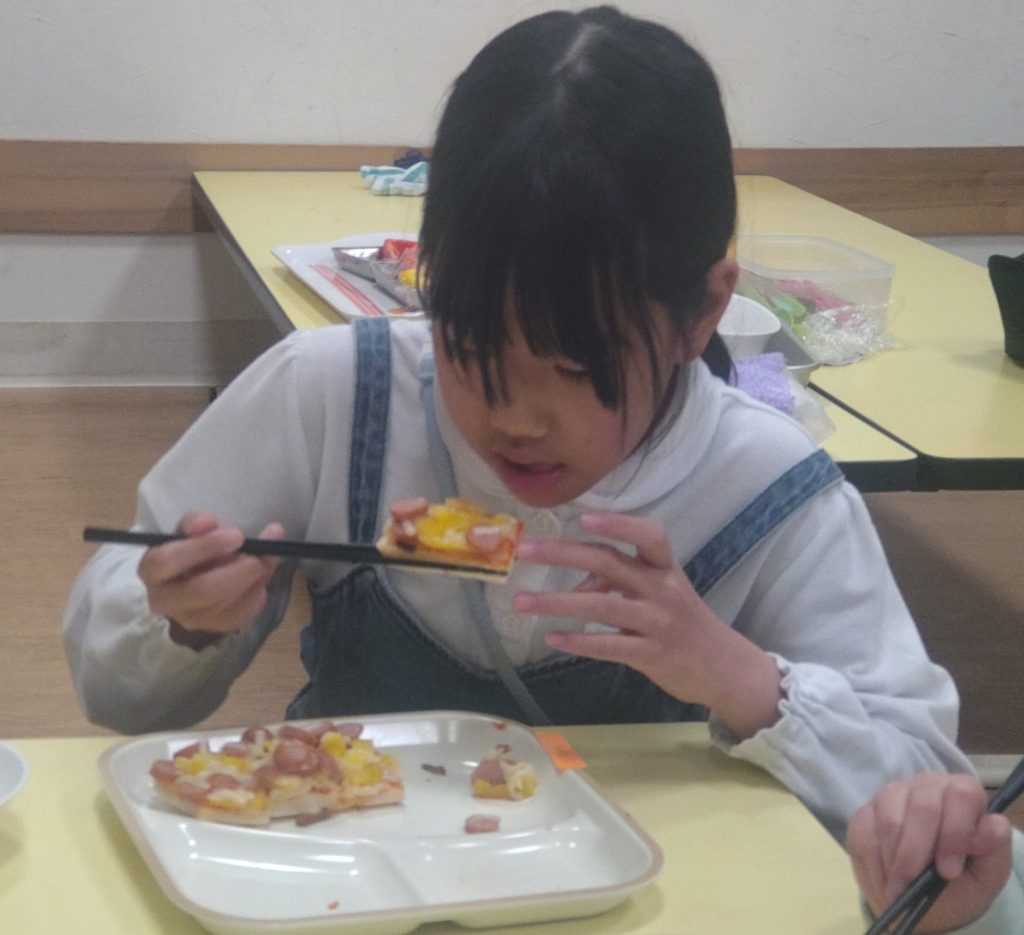 四角いお餅2個をそれぞれ半分にスライスして、一人4個のお餅ピザを作って食べました🤗今回の具材は色とりどりのパプリカと玉ねぎ、ウインナーとチーズです。ジブンでパプリカとウインナーを薄く切りました。野菜は苦手な子も多く、入れるのを渋っていましたが、ジブンでカットした野菜なので「一切れだけならいれる‼」と頑張って食べてくれる子もいて嬉しかったです✨お餅にピザソースを塗って野菜・ウインナー・チーズをのせたら、ホットプレートでチーズがとろけてお餅が膨らんでくるまでしっかり焼きます。いい匂いが漂ってきたら出来あがりです。ミンナ熱々のお餅ピザを「美味しい💛」と食べていました😋4個完食する子がほとんどで、夜ご飯が食べられるか少し心配になりましたが、美味しくできて本当に良かったね😆