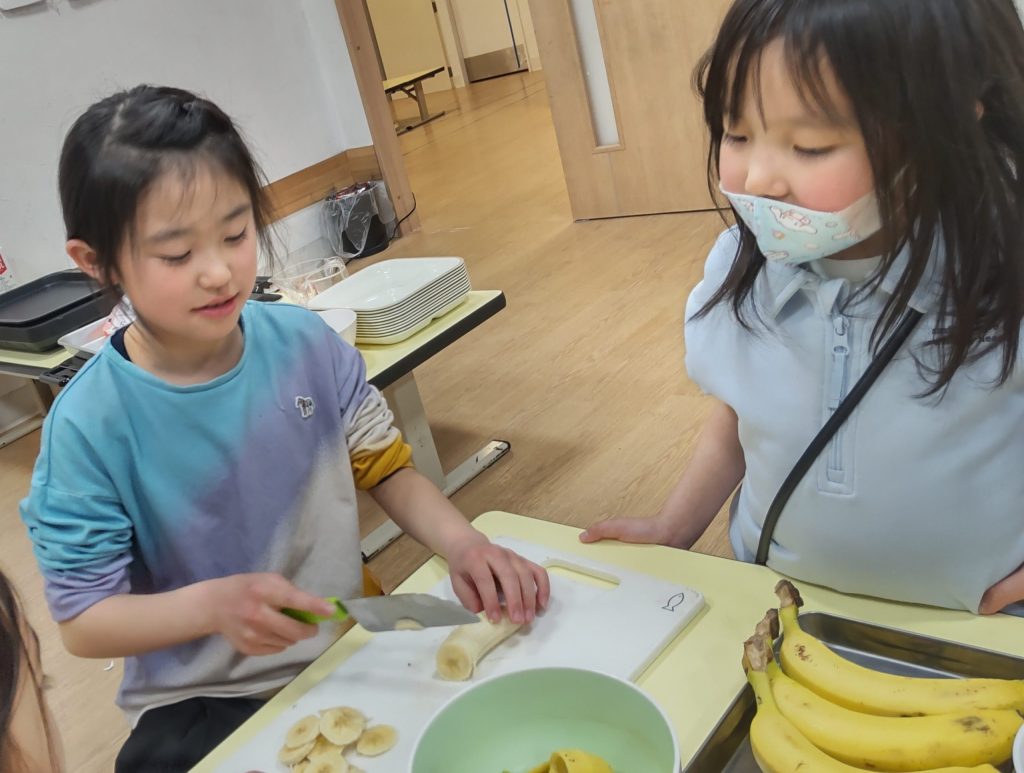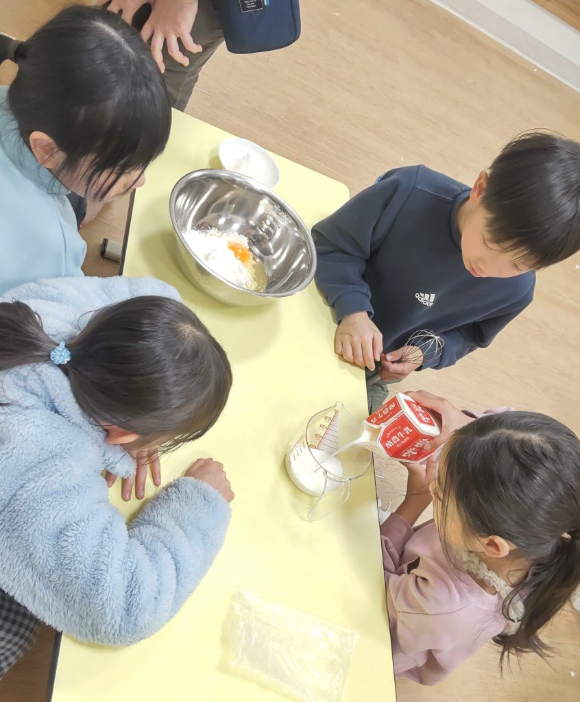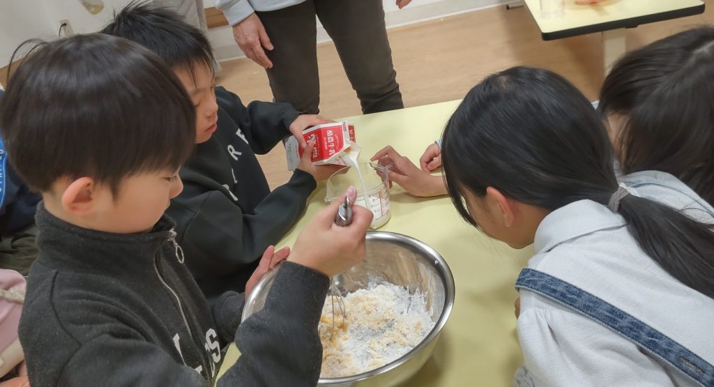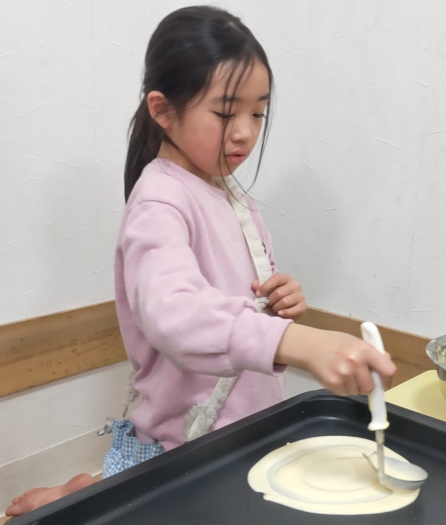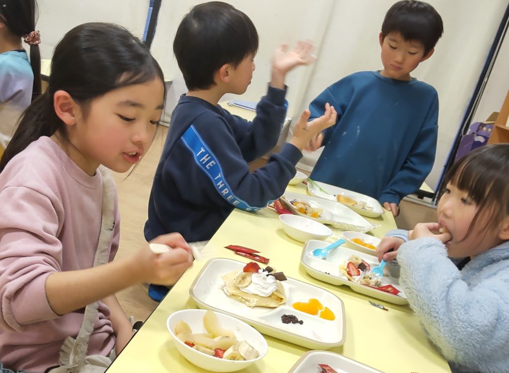 クレープ作りでは、ホットケーキミックス粉を使ってクレープ生地を作ります。ホットケーキよりは牛乳の分量を多くして、生地が薄く焼けるように調整します。牛乳を量り卵を割り入れ生地をよく混ぜます。ホットプレートの上に生地をのせて丸く薄く広げていきます。ジブンの生地が上手く焼けるか、ミンナドキドキしながら焼いたり、ひっくり返したりしました。生地が焼けて冷めた状態になったらお待ちかねのトッピングの時間です⏰ジブンで切った🍌や🍓・🍑・🍊を生クリームの上に思い思いにのせて生地で包み、更に生クリームを塗りチョコや果物を存分にトッピングしました🤗ミンナでいただきますをして、一口食べて『おいしい💛』の声が続出でしたよ✨